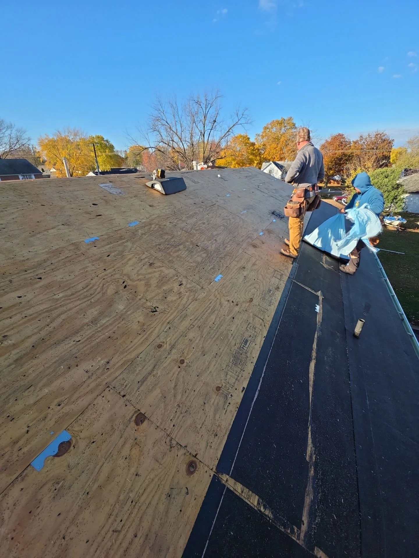 The plywood seam on the roof shows a 1/4” deflection or buckle, the plywood is not compromised but will telegraph through the finished roof